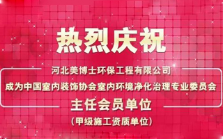 熱烈慶祝河北美博士環(huán)保工程有限公司成為中國(guó)室內(nèi)裝飾協(xié)會(huì)室內(nèi)環(huán)境凈化治理專業(yè)委員會(huì)主任會(huì)員單位。