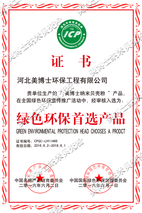 以其得天獨厚的優(yōu)勢,河北美博士環(huán)保工程有限公司生產(chǎn)的“美博士納米貝殼粉”產(chǎn)品在全國綠色環(huán)保宣傳推廣活動中,于2016年6月1日和2日經(jīng)中國名牌產(chǎn)品培育委員會和中國國際綠色環(huán)保管理委員會審核入選為綠色環(huán)保首選產(chǎn)品,有效期為2016年6月2號至2018年6月1號。